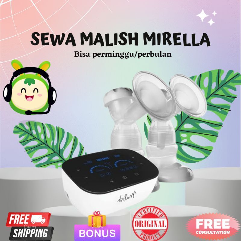 Pompa ASI Elektrik Malish All New Mirella Spesifikasi All New Mirella • Pompa payudara listrik, tipe ganda, dengan dua motor dapat menyesuaikan kiri, kanan dengan bebas • Baterai internal dapat digunakan hingga 5 siklus dengan pengisian penuh (5 jam) – Rechargeable • Sudah Closed System dan Hospital Grade • Layar berwarna cerah dan warna-warni • Suara lebih tenang dari model sebelumnya • Ringan dari model aslinya • Hospital Grade tetapi ukuran mesin kecil • Terdapat 4 Fase (Fase Stimulasi, Fase Ekspresi, Fase Stimulasi 10x – Ekpressi 10x atau Fase 2 in 1 dan Fase Malish) • Memiliki 4 Mode (Mode Kiri, Kanan, Double dan Alternative) • Fase Malish merupakan fase dimana mesin bekerja secara terus menerus dari 3 menit stimulasi dan 7 menit fase ekspresi yang berkelanjutan hingga waktu habis. • Jam alarm untuk sesi pompa berikutnya bikin nggak kelewat jadwal mompa • Tombol jeda, sehingga ibu dapat terus memompa tanpa harus mulai menghitung detik kedua lagi • Tombol layar kunci operasi yang membantu mencegah mengubah mode pengoperasian mesin saat memompa • Garansi 2 tahun, 1 tahun untuk motor, baterai dan jasa, 1 tahun lagi hanya jasa (kondisi dari pemakaian saya baru. saya hanya pakai 3 bulan). insyaAllah semua dalam kondisi yang baik