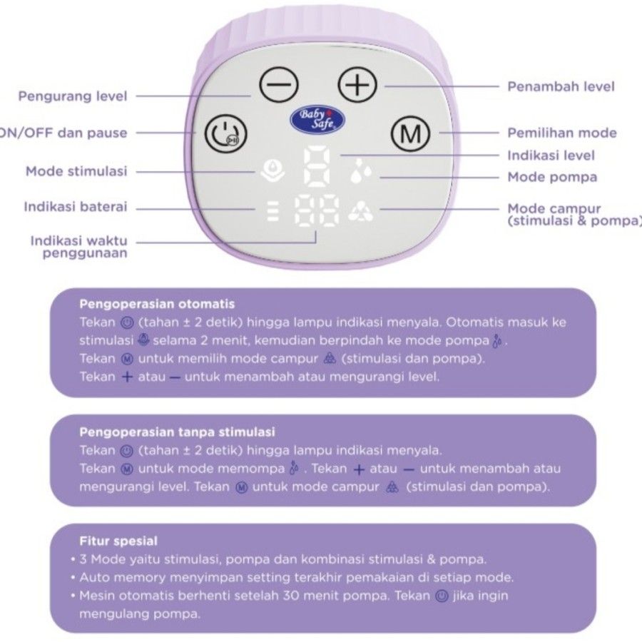 Pompa ASI praktis yang bisa digunakan tanpa dipegang, dapat diselipkan ke dalam bra, memudahkan Bunda melakukan kegiatan lain sambil memompa ASI. Breast Pump ini memiliki mode stimulasi, menghisap dan gabungan stimulasi dan menghisap. Stimulasi dan daya hisapnya dapat diatur hingga 9 level, menyesuaikan kebutuhan bunda.