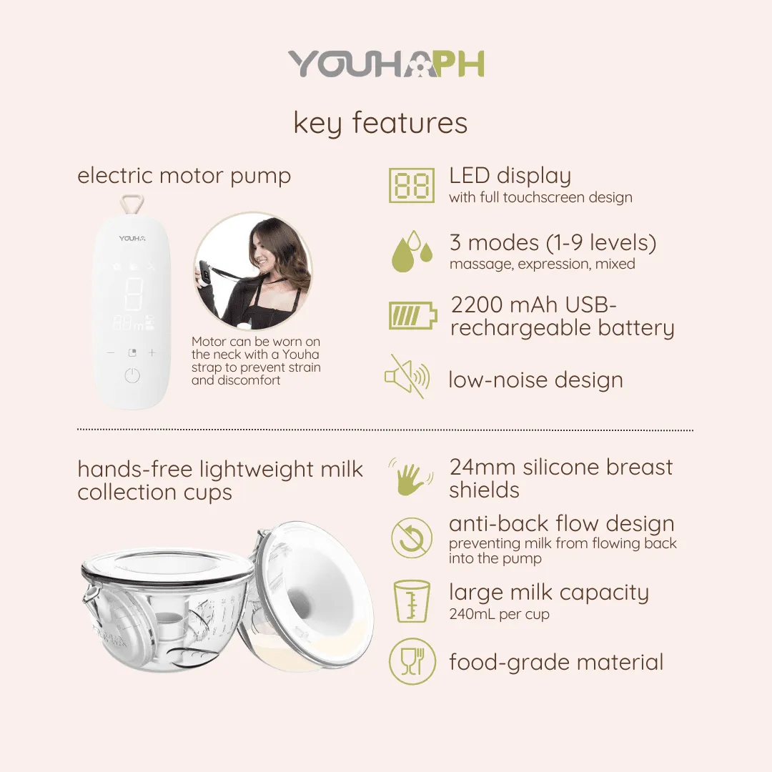YOUHA DUO HANDSFREE Breastpump didesain secara ergonomis agar tangan dapat bergerak bebas ketika sedang memompa. Cara memakainya sangat mudah, Moms tinggal menyematkannya di dalam bra, sehingga tidak perlu dipegang tangan lagi saat memompa.